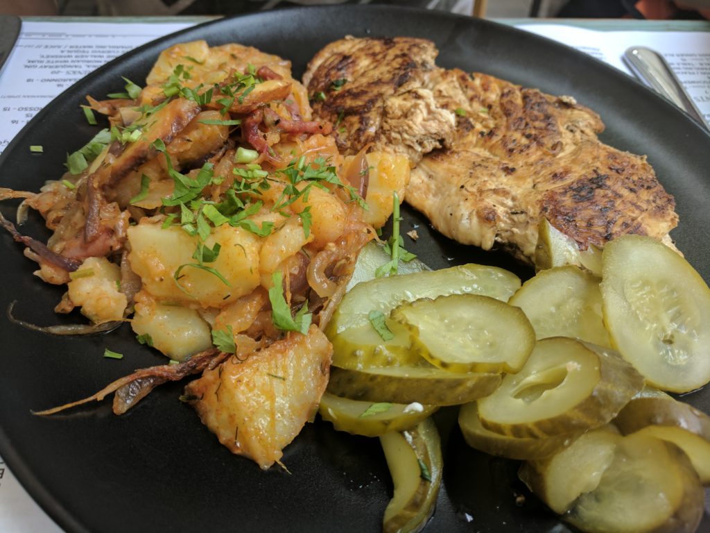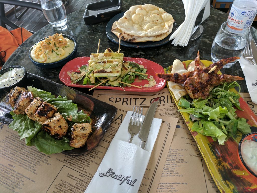 האוכל שם מושפע מהמטבח היווני, הודי ורומני. אנחנו הזמנו מנת עוף טנדורי, קישואים על טציזיקי, מנה קציצות בשר ופיתות הודיות. האוכל היה ממש טעים. המנות היו קלילות ומשביעות.