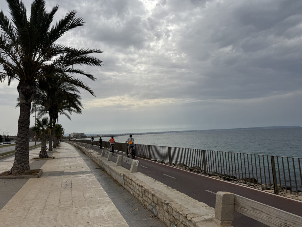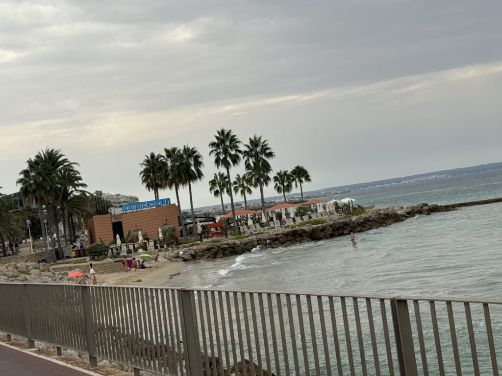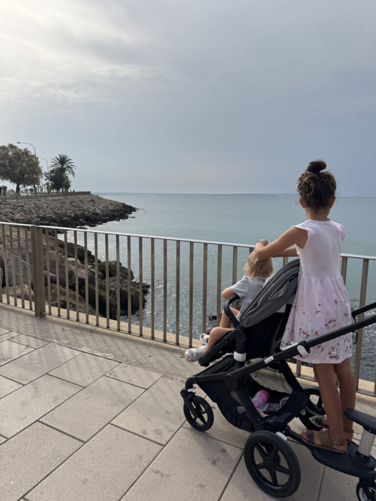 אחרי שיטוט בעיר העתיקה הלכנו עם העגלה לאורך הטיילת, שהיא רחבה ומוצלת בעצי דקל. הילדים נהנו לראות את הספינות והאניות בנמל, וההליכה הייתה נוחה גם עם עגלות. הלכנו כ-20 דקות עד שהגענו לחוף ולמסעדת חוף. באמצע הטיילת ראינו גם גן משחקים בצד השני, שיכול להיות מקום נחמד לעצירה עם הילדים.