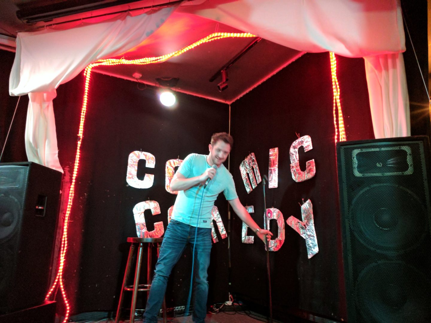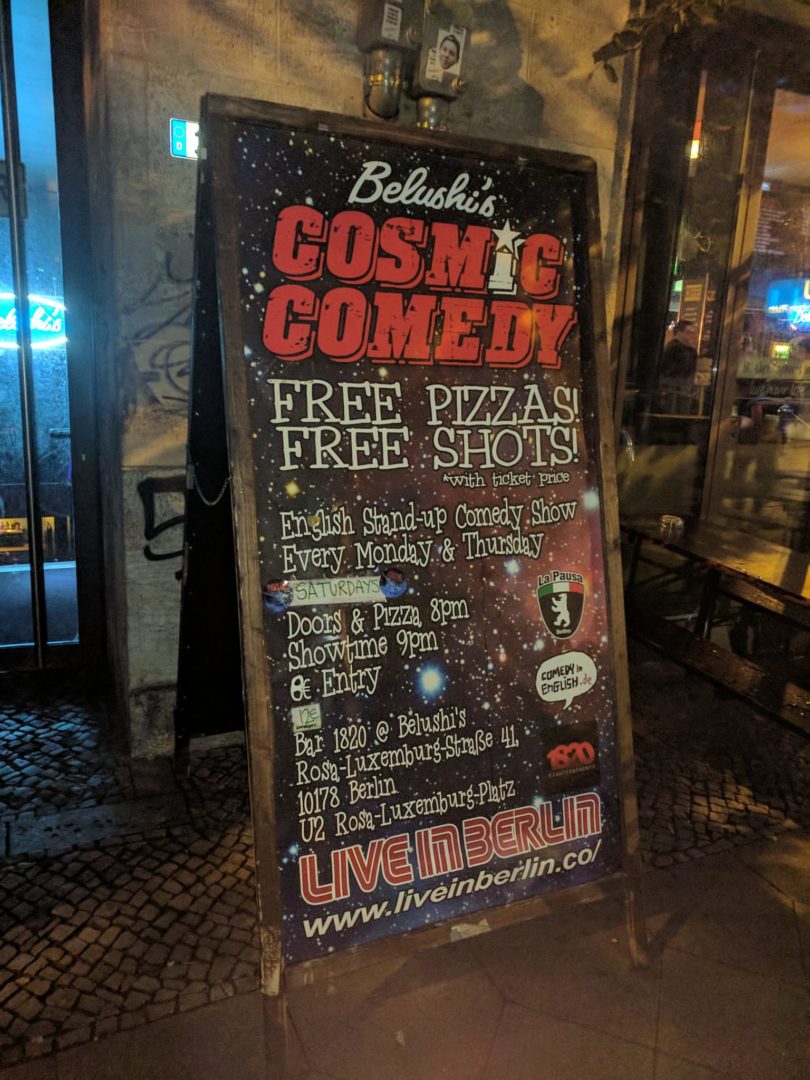 אחד מהבילויים האהובים עליי זה מופעי סטאנדאפ (האהוב עליי היה בניו יורק) אז כשנתקלתי במודעה על מופע סטאנדאפ באנגלית בעלות 8 יורו כולל פיצה ועם ביקורות ממש טובות, ידעתי שאני חייבת לשם. כל חמישי ושבת יש במה פתוחה.