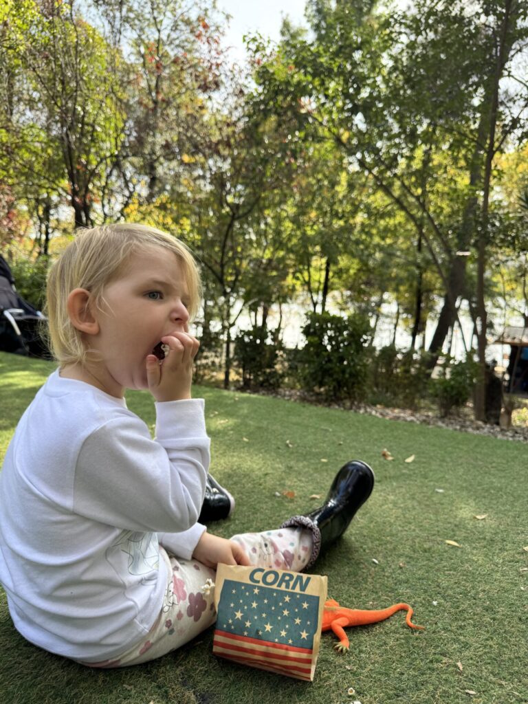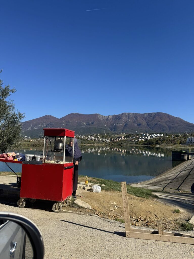 כשחזרנו לכיוון הרכב ראינו בדיוק אישה מבוגרת שהגיעה עם עגלת פופקורן אז מאיה ישר רצה אליה כדי לקנות. היא קנתה שקית של פופקורן צבעוני ביורו אחד, והאישה נתנה לנו גם שקית רגילה בחינם. מאיה הכריזה ש”באלבניה יש את האנשים הכי נחמדים שיש”.