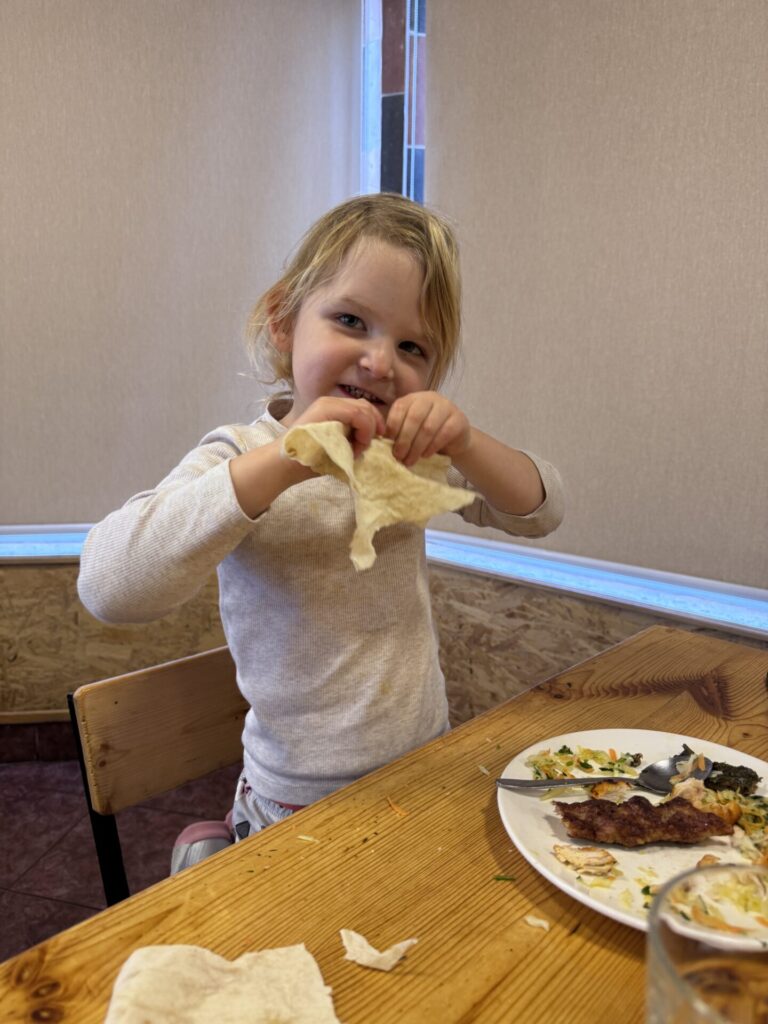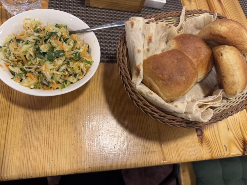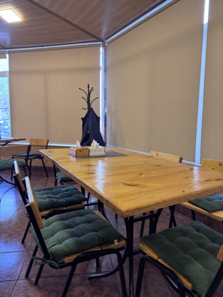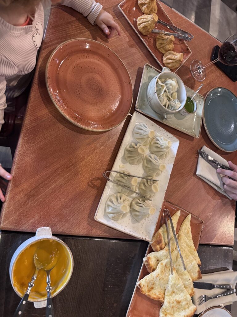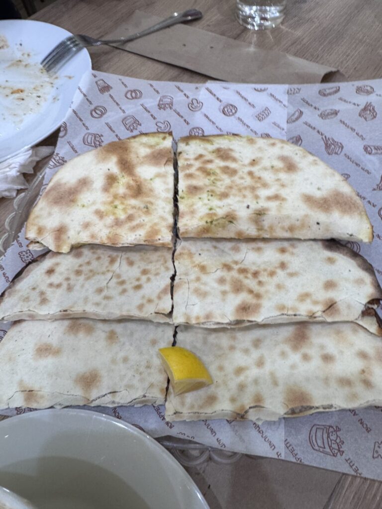Sherep – מסעדה שנמצאת ממש ליד כיכר רפובליקה. נכון, היא מתויירת, אבל אל תתנו לזה להרתיע אתכם, היא באמת טובה. נהג המונית המליץ לנו עליה, והוא לגמרי צדק. הזמנו מרק דלעת, שתי מנות חינקלי, חינקלי מטוגנים, ירקות בגריל, כיסוני תרד, חצ’פורי ושתייה קלה. הכול היה טעים מאוד, אבל החינקלי והכיסונים היו שיא הארוחה מבחינתי. הבנות, כצפוי, התאהבו בחצ’פורי. סך הכול שילמנו כ־35 יורו על הכול, מחיר מצוין לארוחה כזו.