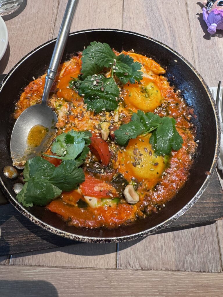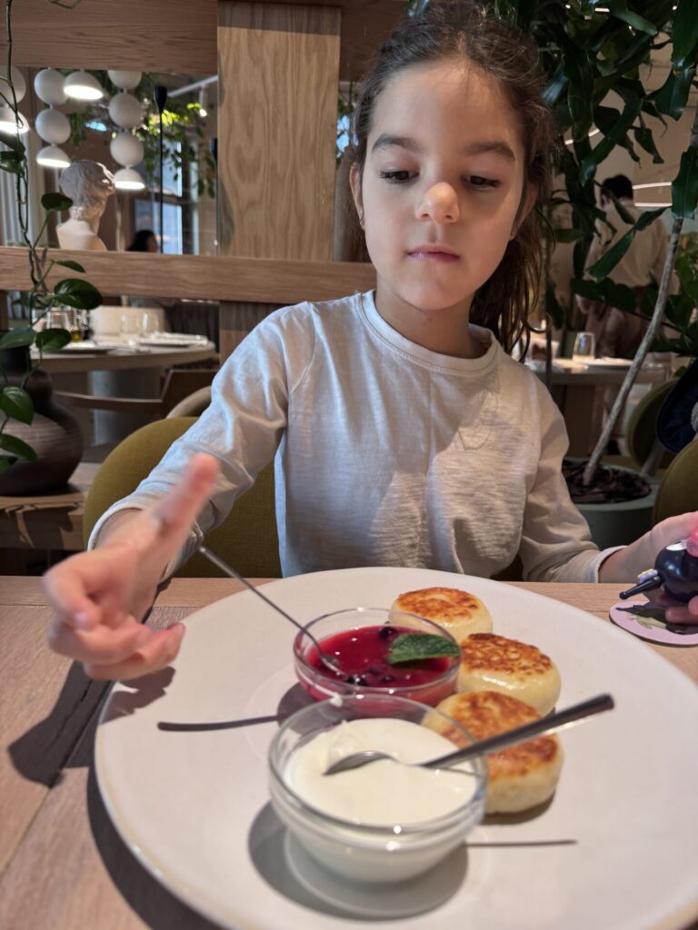 Syrovarnya – מסעדה שנמצאת ליד שני המלונות שבהם ישנו. במלון הראשון (Erebuni) ארוחת הבוקר הייתה בסיסית והבנות פחות התחברו, אז בבוקר השני יצאנו לאכול כאן. בדיעבד, זו מסעדה שמתאימה גם לצהריים או ערב. המקום מודרני ויפה, יש פיצות בטאבון, קפה טוב ולחם מצוין. הזמנו שקשוקה (טעימה מאוד, אם כי היה חסר לי קצת יותר עגבניות) וכמה מנות סירניקי – פנקייק ריקוטה רוסי עם שמנת חמוצה ופירות יער. המנה הזאת הייתה אהובה על כולם.